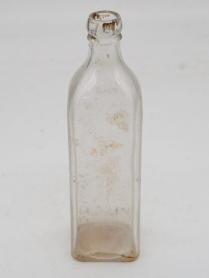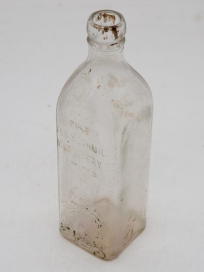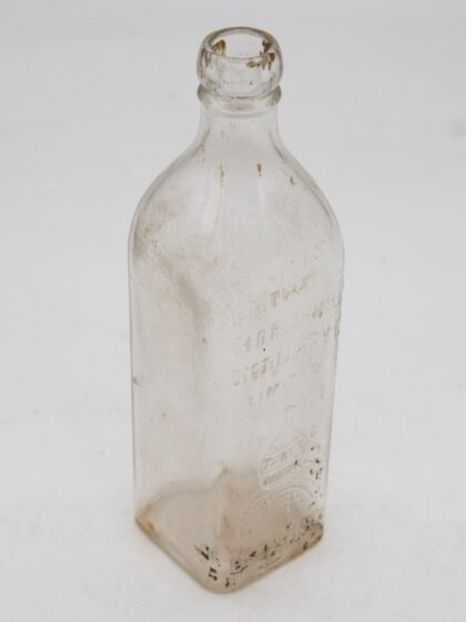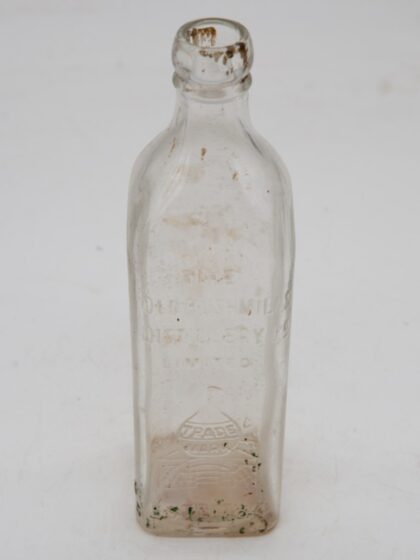 A clear glass bottle for Old Bushmills Whiskey.