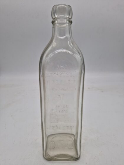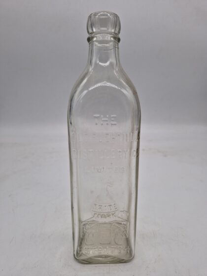 A clear glass bottle for Old Bushmills Irish Whiskey.