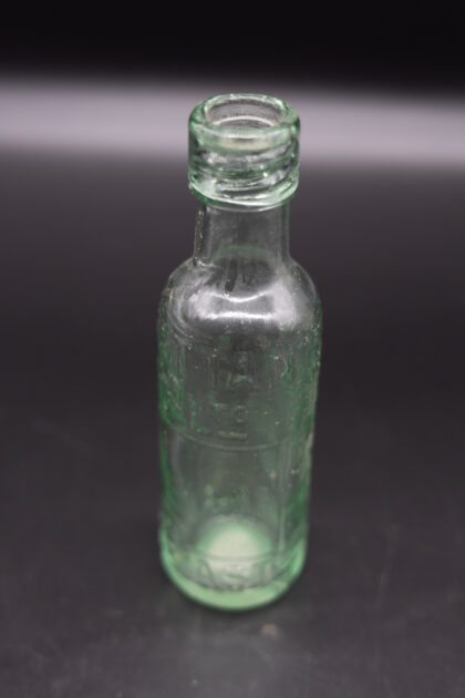 A small clear glass bottle for Grattan & Co. Ltd. The Original Makers of Ginger Ale.