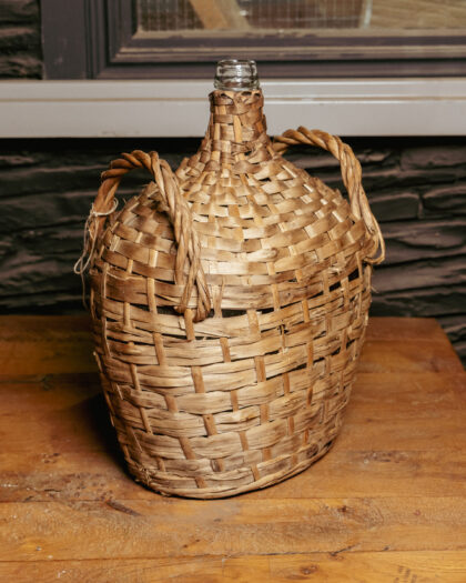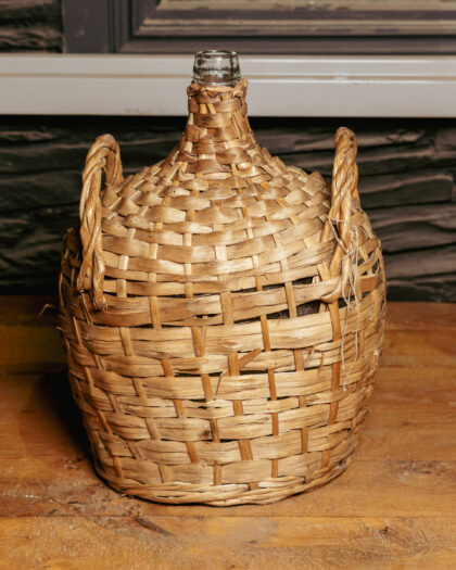 Large wicker-cased glass bottle.