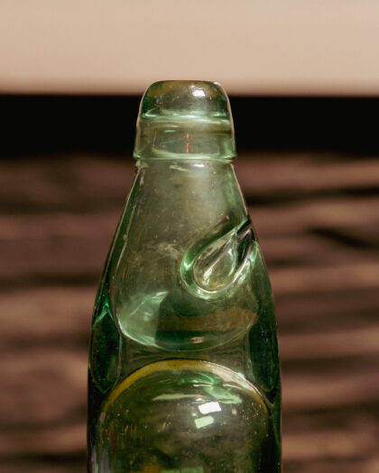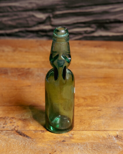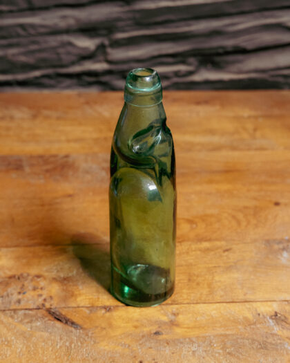 A green glass bottle with a Codd-neck and marble.