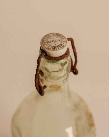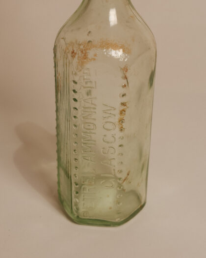 A clear glass bottle for Petrel Ammonia Ltd. Glasgow with embossed tablespoon marker and porcelain flip top lid.