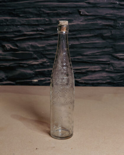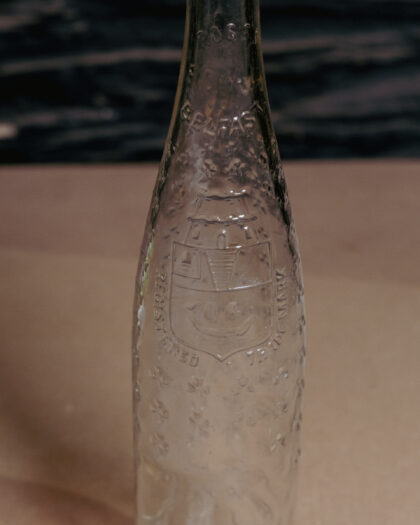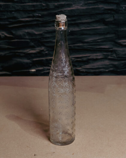 A tall, clear glass bottle with all over shamrock pattern for Ross's Royal Belfast, complete with cork.