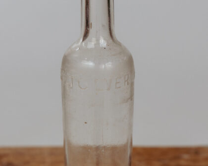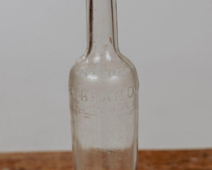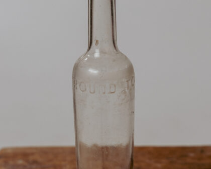 A clear glass bottle branded "Round Tower Brand".