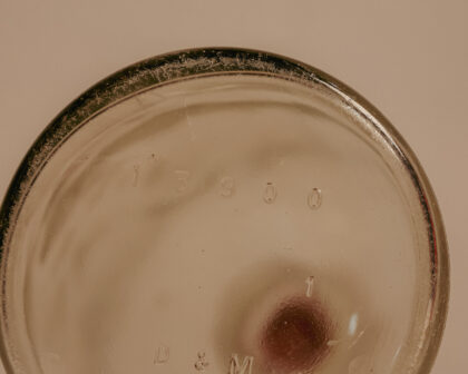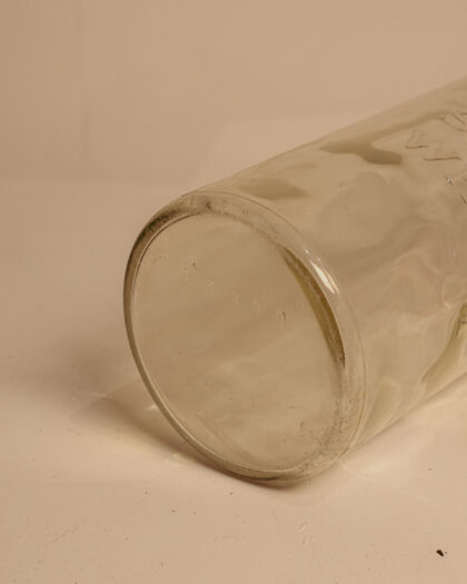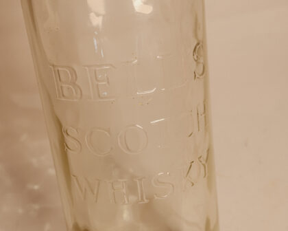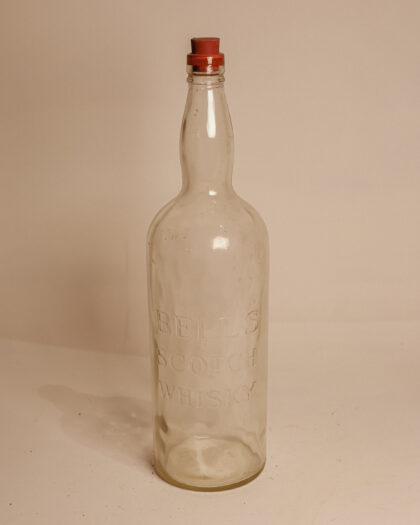 An oversized clear glass bottle for Bell's Scotch Whisky.