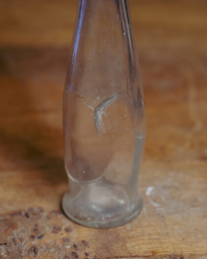 A clear glass bottle which would originally have held sauce.