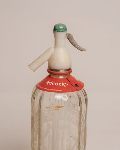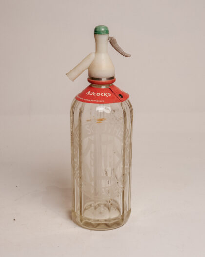 A glass syphon with white plastic top for The Southern Table Water Co. Ltd.