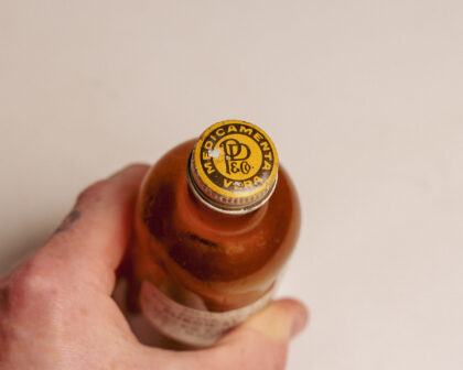 A brown glass bottle with a label for Surgical Spirit from a Dublin chemists.