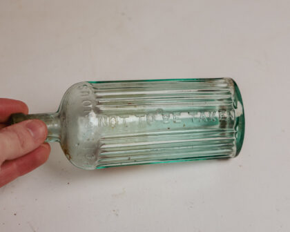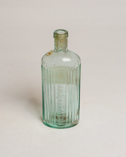 A clear ribbed glass bottle with a label for Embrocation from a Belfast chemists.