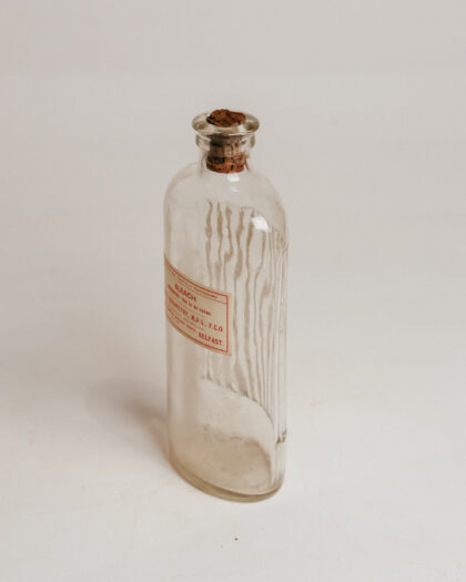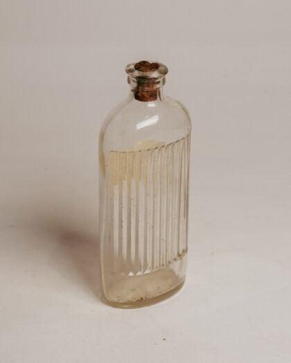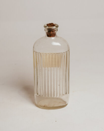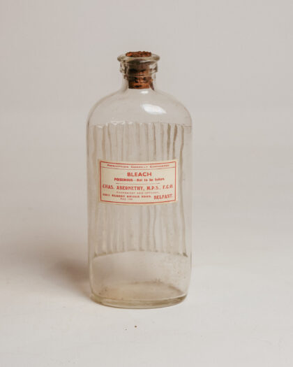 A clear ribbed glass bottle with a label for Bleach from a Belfast chemists.