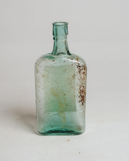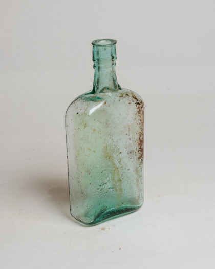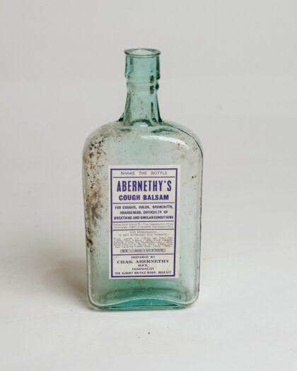 A clear glass bottle with a label for Abernethy's Cough Balsam from a Belfast chemists.