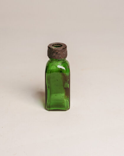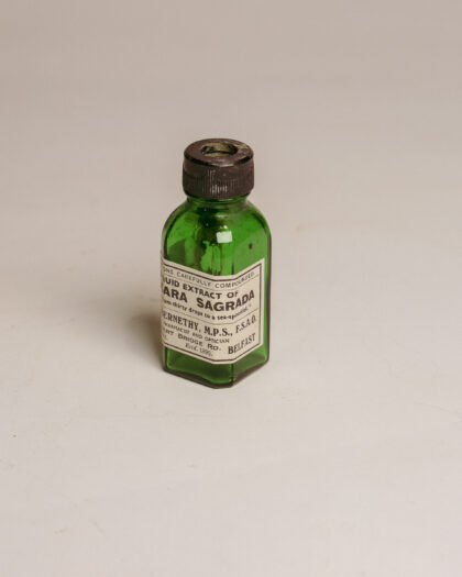 A green glass bottle with a label for Liquid Extract of Cascara Sagrada from a Belfast chemists.