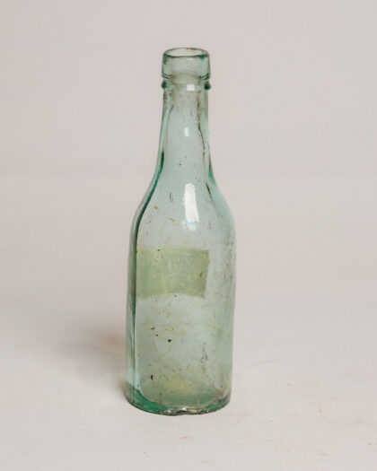 A clear glass bottle with a label for Lime Water from a Belfast chemists.