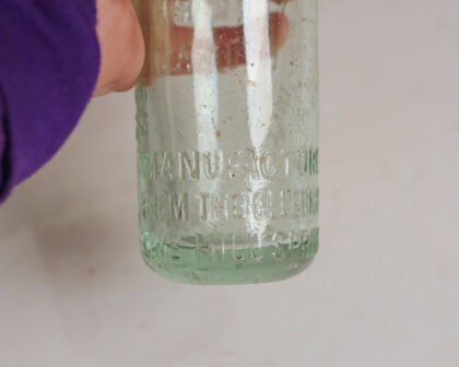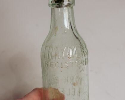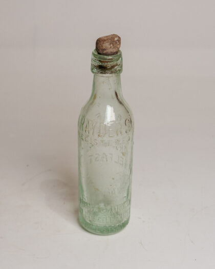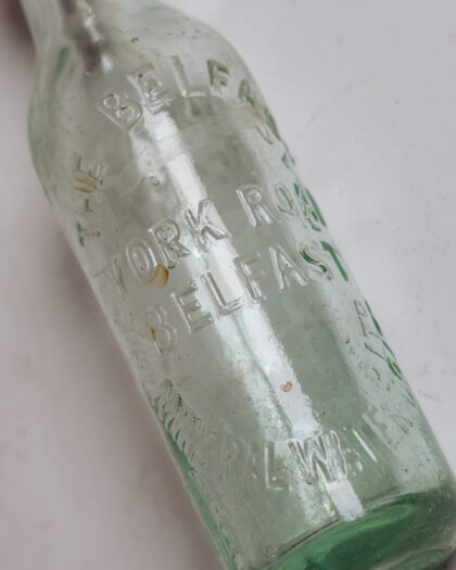 A clear glass bottle with stopper for the Belfast Mineral Water Co. Ltd. York Road.