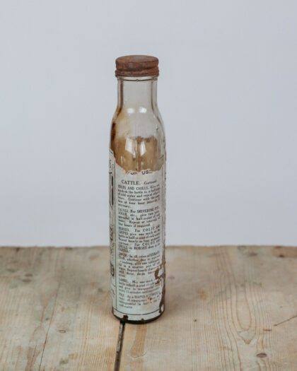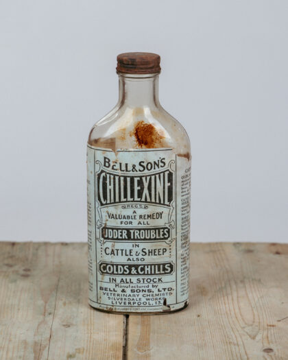 A glass bottle with label for Chillexine, an agricultural bovine medicine for udder troubles made by Bell & Sons Ltd. Liverpool, England.
