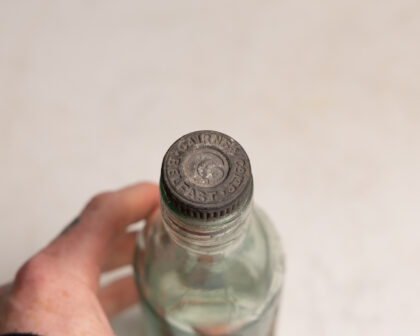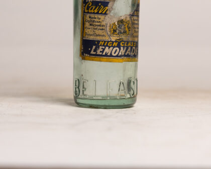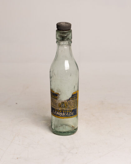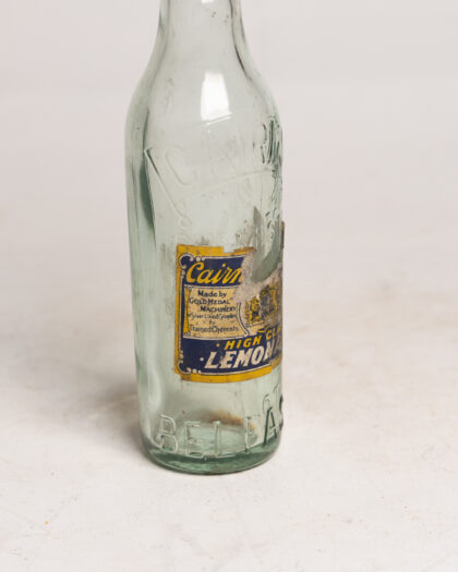 A clear glass bottle with stopper and label for Cairn's Belfast High Class Lemonade.