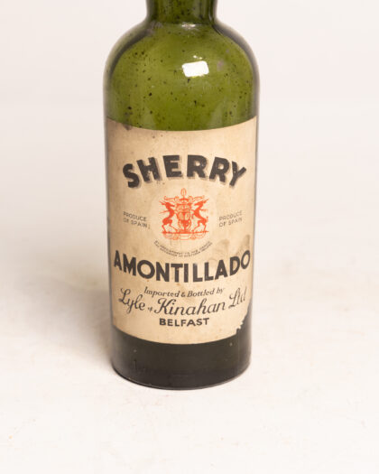 A green glass bottle with label for Lyle & Kinahan Ltd Belfast Sherry Amontillado.