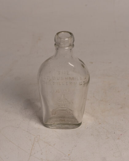 A clear glass bottle for The Old Bushmills Distillery Co. Irish Whiskey.