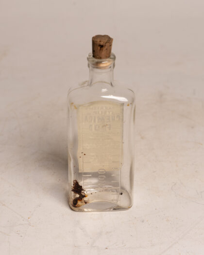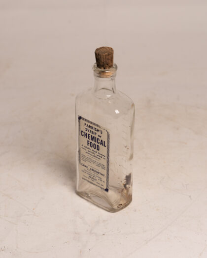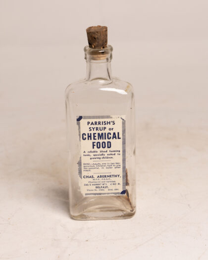 A clear glass bottle with cork stopper and label for Parrish's Syrup or Chemical Food from a Belfast pharmacist.