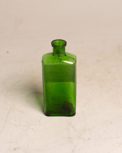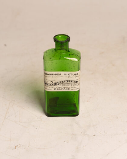 A green glass bottle with applied label for Diarrhoea Mixture from a Belfast pharmacist.