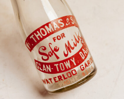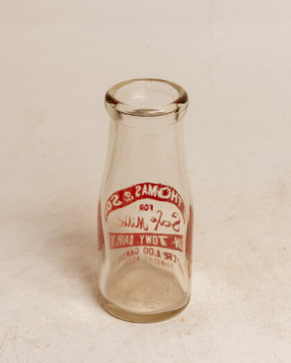A clear glass milk bottle for W. Thomas & Son Glan-towy Dairy Waterloo Gardens.
