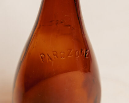 A brown glass bottle for Parozone.