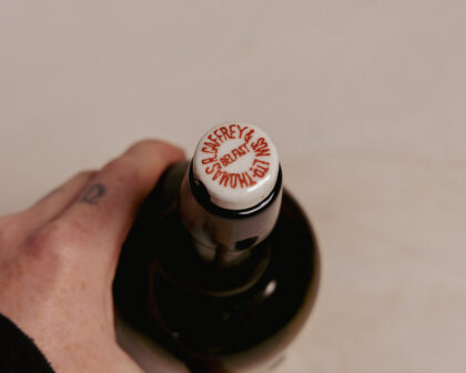 A dark green glass bottle for T. R. Caffrey & Son Ltd. Belfast complete with ceramic stopper.
