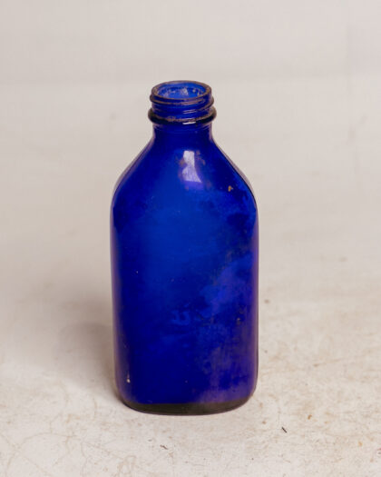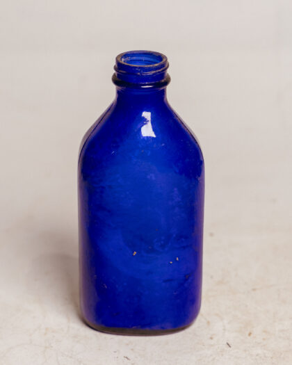 A vibrant blue glass bottle, perfect for adding a pop of color to any space. This vintage bottle measures 17cm in height. Ideal for display, upcycling projects, or as a unique decorative piece.