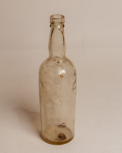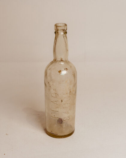 A large clear glass bottle for Flag Sauce.