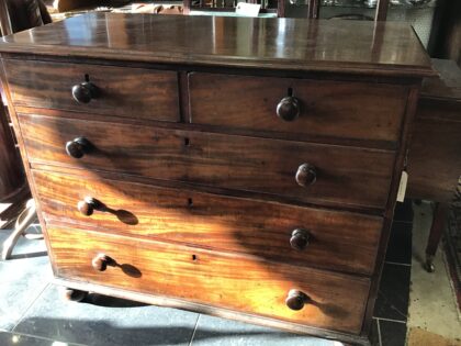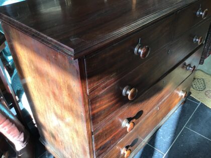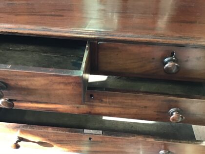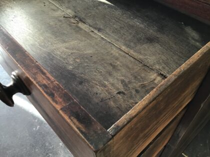 Oak-lined drawer boxes, and period turned handles, sitting on original fat bun feet.