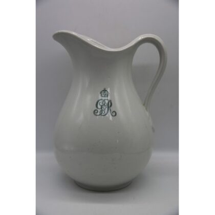 A George V white glazed Minton pottery jug with 'C' scroll handle and green insignia, raised on circular foot. Bears marks to base.
