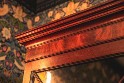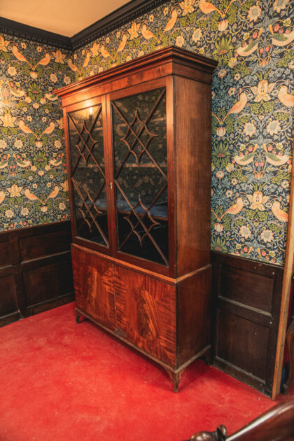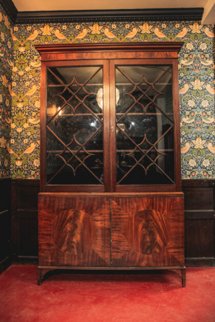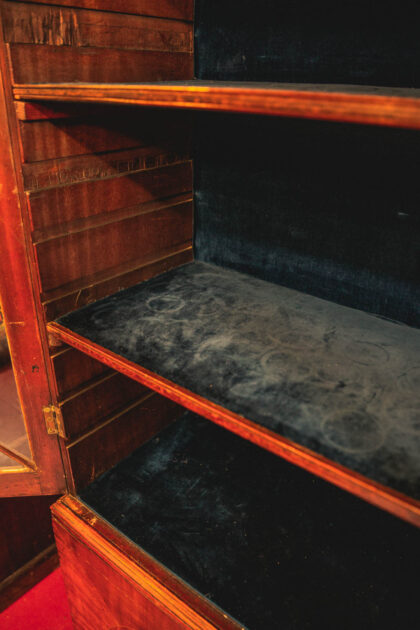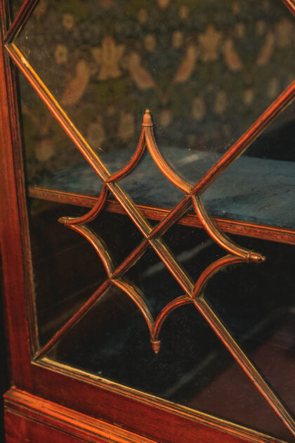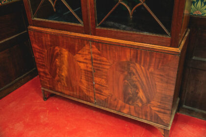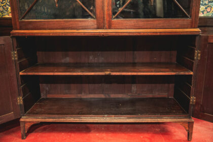 Stunning 200 year old regency period bookcase with fine wood detailing to glass doors. Adjustable shelves lined with blue velvet. Fine modest veneer and banding to lower doors.