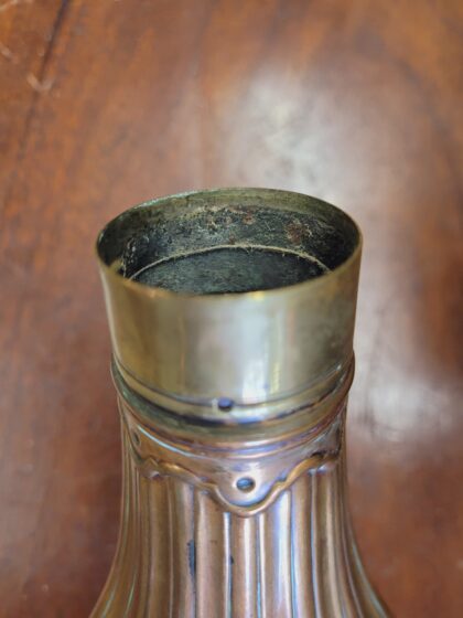 A Georgian copper and brass pear-shaped gunpowder shot flask. Missing it's cap.
