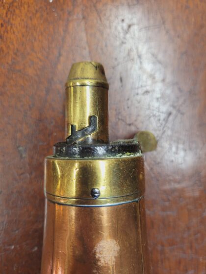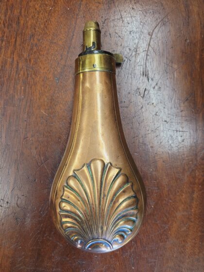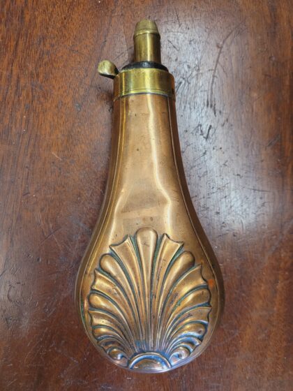 A Georgian copper and brass pear-shaped gunpowder shot flask.