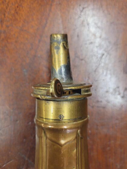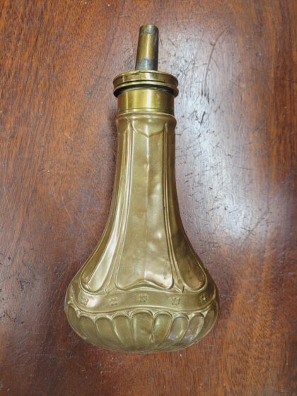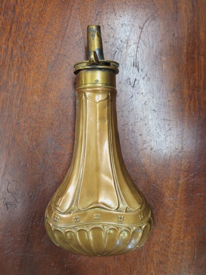 A Georgian copper and brass pear-shaped gunpowder shot flask.