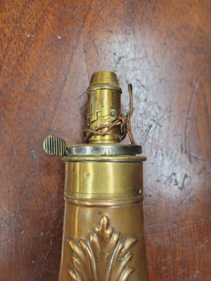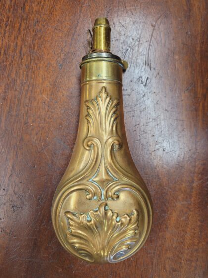 A Georgian copper and brass pear-shaped gunpowder shot flask.