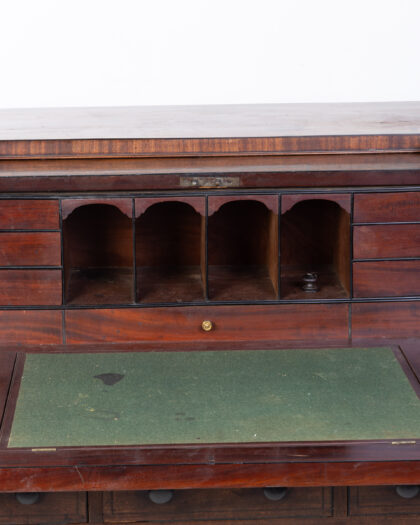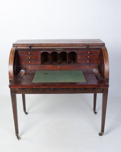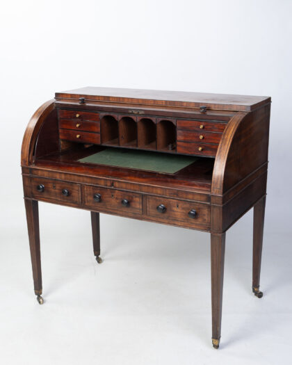 Elegant Georgian circa 1800 roll top desk. This antique desk features a beautiful curved roll top that smoothly retracts to reveal a writing surface covered in green baize. Inside, are pigeon holes and small drawers for storage. Below the roll top are two faux drawers over three working drawers, all with black wooden pulls. The desk stands on slender, tapered legs fitted with castors, typical of the period. The wood has a rich, warm brown patina. This piece is a true statement of Georgian craftsmanship, perfect for a study or living area. In very good condition for its age, with some signs of wear commensurate with age and use.