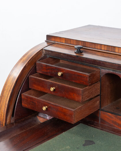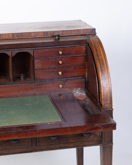 Georgian roll top desk, circa 1800. Mahogany, with tambour roll, drawers, and interior fittings. Elegant period piece.
