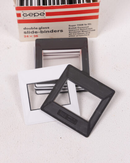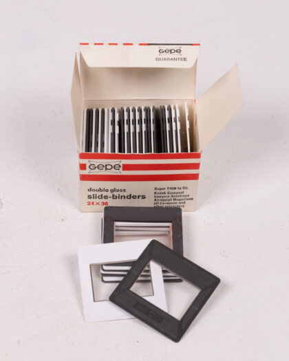 A full, original box of Gepe double glass slide binders, designed for 24x36mm slides. These vintage slide mounts are in excellent condition and come in their original packaging, offering a complete and ready-to-use solution for organizing and preserving photographic slides. The box contains a mix of black and white frames. "Super Thin to fit Kodak Carousel, Sawyers Rototrays, Airequipt Magazines all European and other projectors". A great find for photography enthusiasts and collectors.
