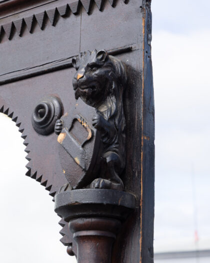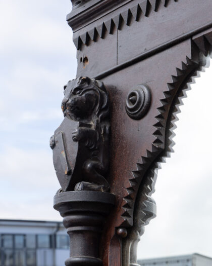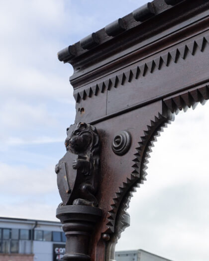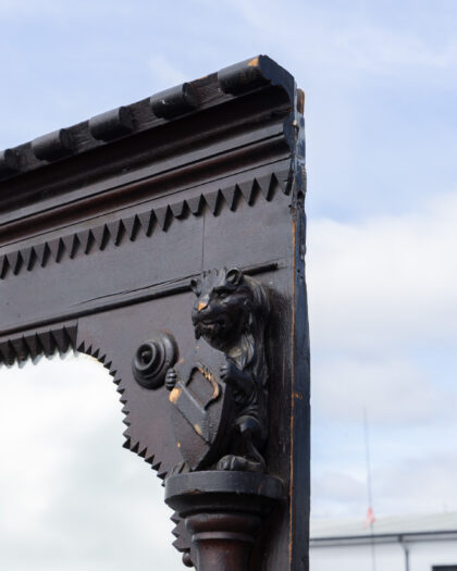 Discover this imposing antique Victorian full-length mirror, featuring a richly dark-stained wooden frame. The ornate design boasts substantial carved pillars, intricate embellishments, and a distinctive sawtooth border, showcasing the craftsmanship of the era. Reputedly originating from a historic London brothel, this piece carries a unique story and adds an unparalleled sense of character and grandeur to any space. Its age-commensurate wear and tear contribute to its authentic antique charm, making it a captivating focal point for a living room, bedroom, or grand hallway.