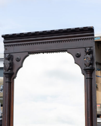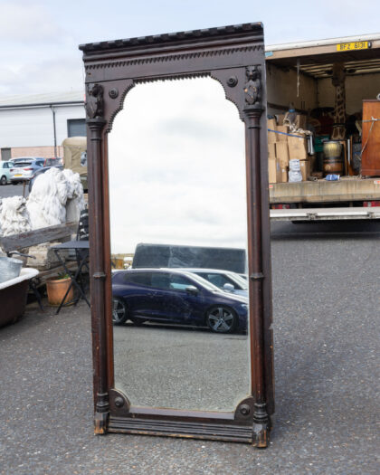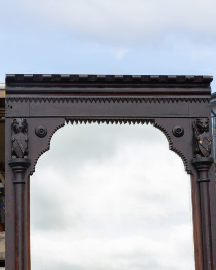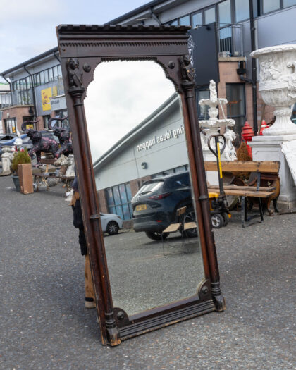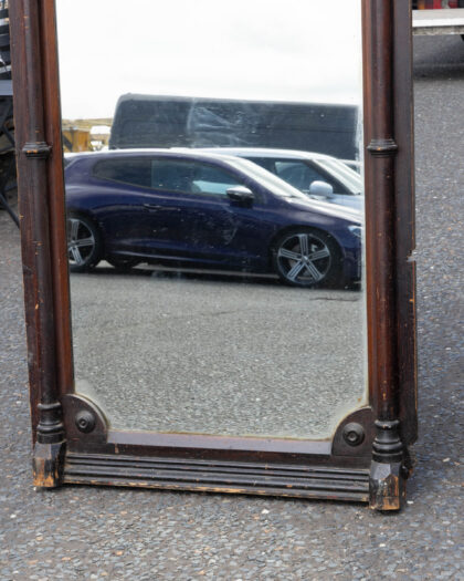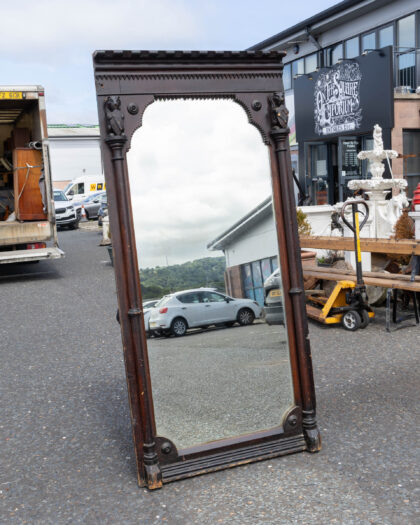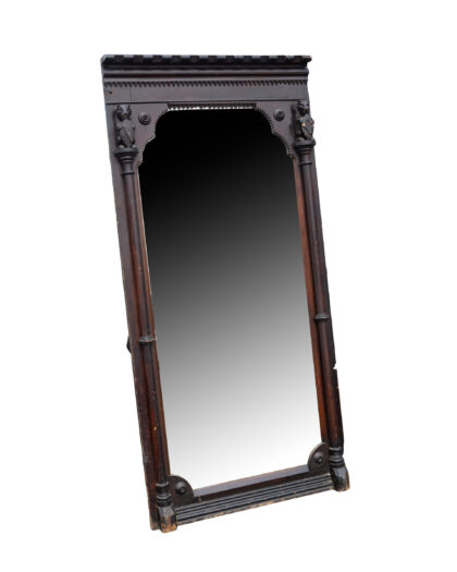 Imposing antique Victorian full-length mirror with dark-stained carved wood frame, ornate pillars, and sawtooth border. Authentic age-related charm.