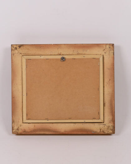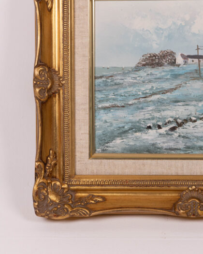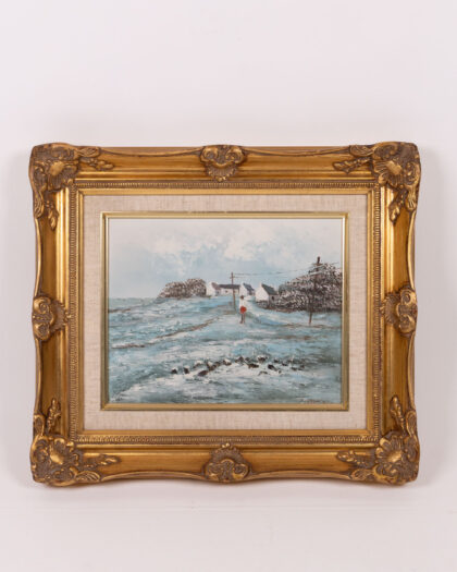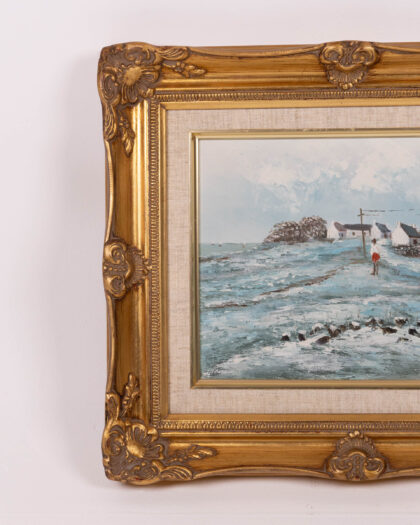 Original oil painting of a coastal landscape with a figure walking towards cottages. Gilt frame. A lovely addition to any home.