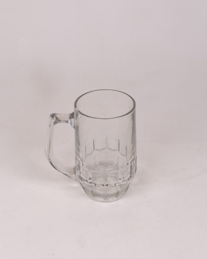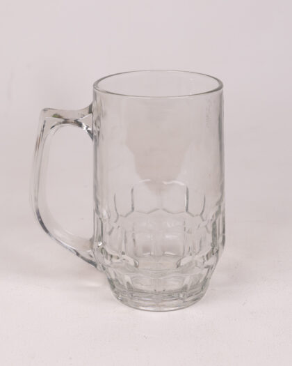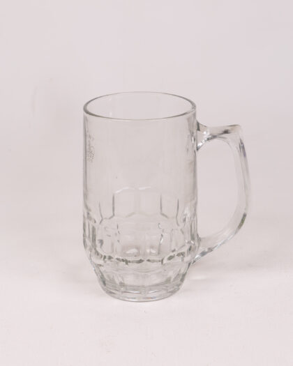 This is a sturdy glass beer mug, perfect for enjoying your favorite brew. The mug features a classic design with a paneled base and a thick handle for a comfortable grip. Its clear glass construction allows you to appreciate the color and clarity of the beer. Ideal for home bars, gatherings, or a casual night in. Excellent condition with no chips or cracks.