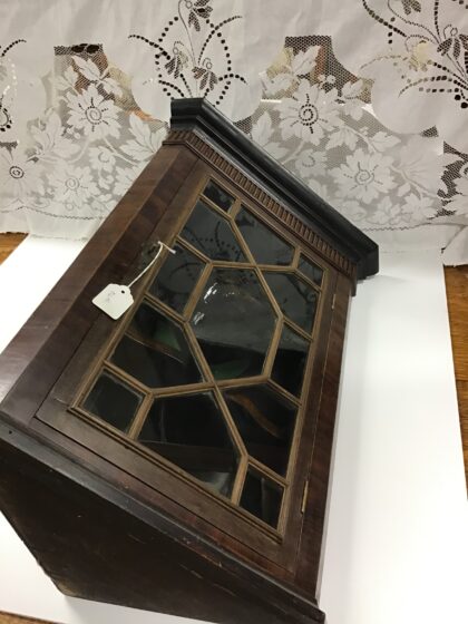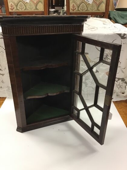 Wall -hanging wooden corner cabinet with glass front. Lockable with key. 63cm tall, 25cm depth, 45cm wide.
