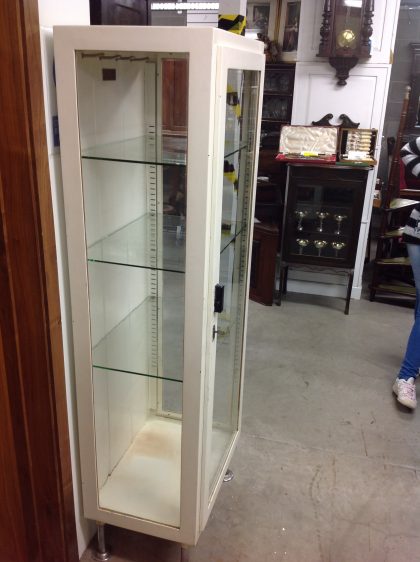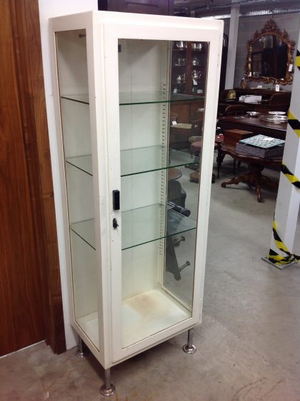 Glass panel cabinet, with steel construction; formerly a medical cabinet in a Polish hospital.