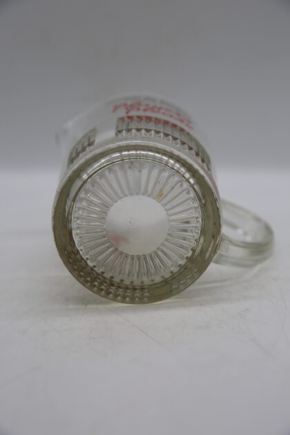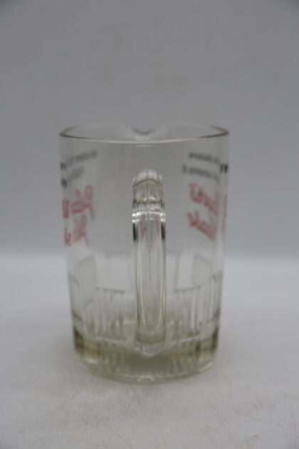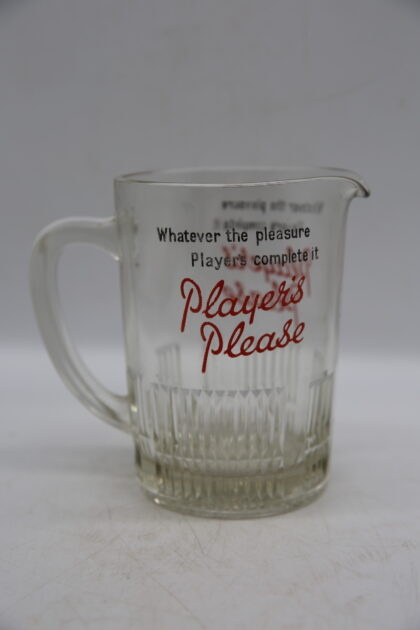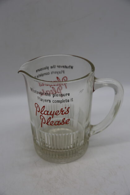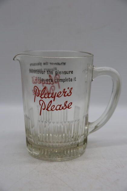 A glass bartop water jug. Bears black and red lettering which reads, "Whatever the pleasure Player's complete it Player's Please".