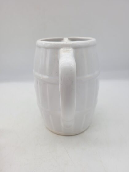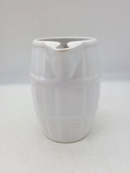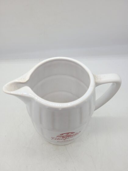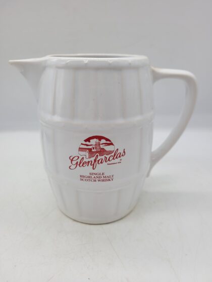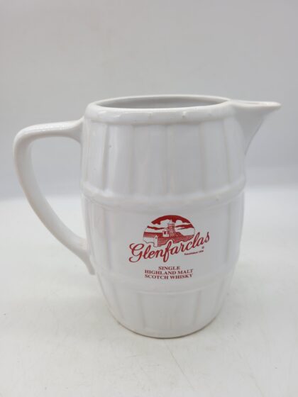 A white glazed ceramic bartop water jug in the shape of a barrel. Bears red lettering which reads, "Glenfarclas Single Highland Malt Scotch Whisky".
