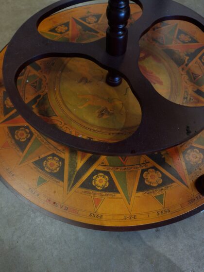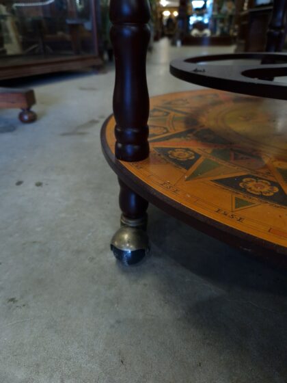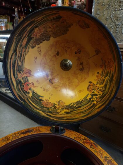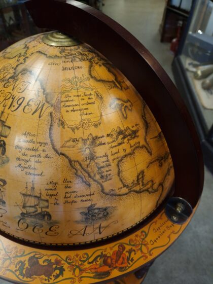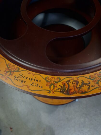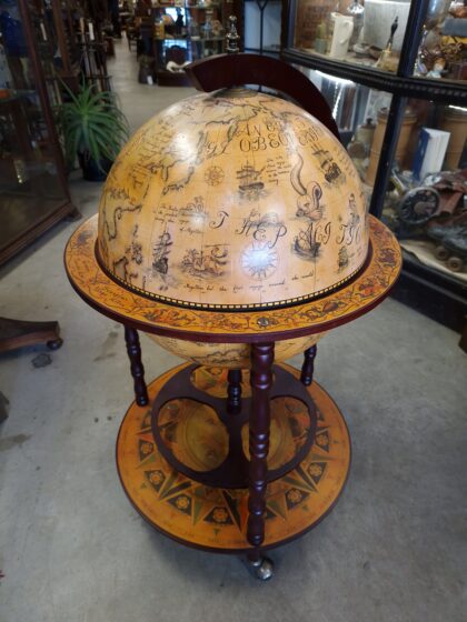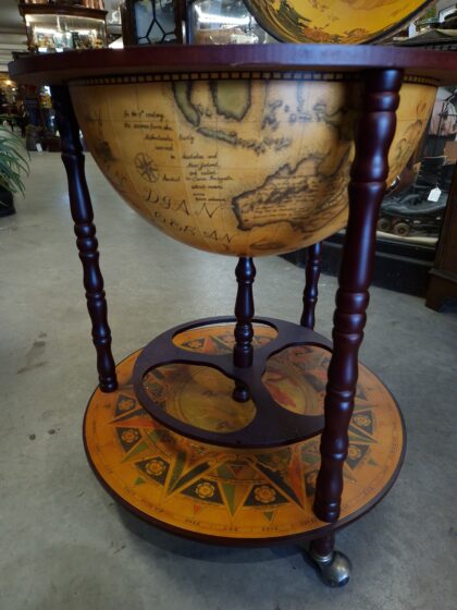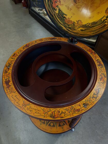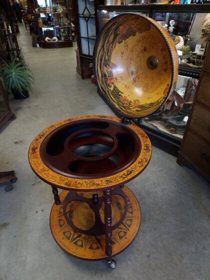 A large drinks cabinet on wheels in the form of a globe. Decorated inside and out, this globe opens in half to reveal sections for bottles and other cocktail-making equipment. It also features a lower shelf for more bottle storage. A real talking piece for parties!