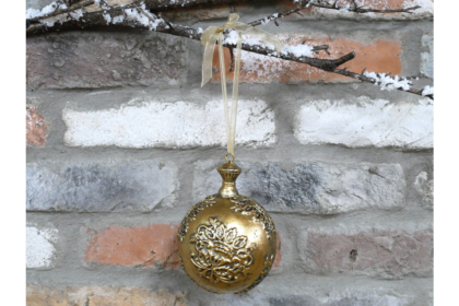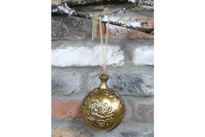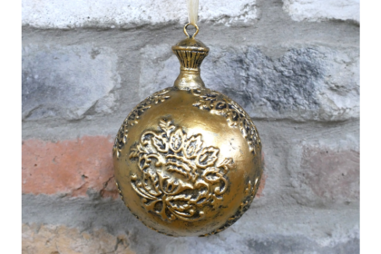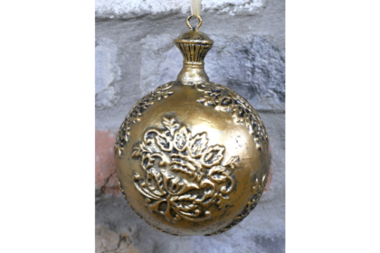 A brand new gold-tone Christmas ornament with a decorative floral design. Includes a gold ribbon for hanging.