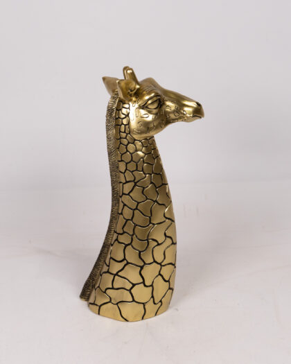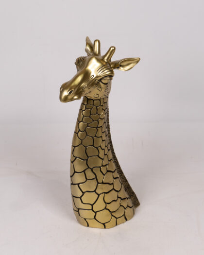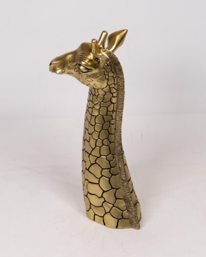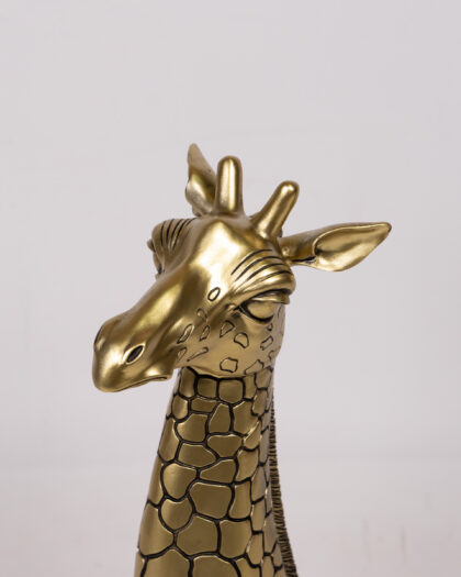 Striking gold giraffe head sculpture. A unique home decor ornament to add personality to your shelves, desks, or mantelpieces.
